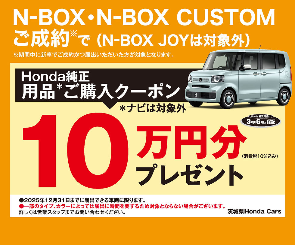■対象車種:N-BOX・N-BOX CUSTOM(N-BOX JOYは対象外)を新車でご成約かつ届出いただいた方が対象となります。■プレゼント金額は用品代+工賃の合計分となります。■クーポンはご成約いただいた販売店でのみ有効です。■クーポンは対象車種のHonda純正用品(Hondaカーケアメニュー、ケミカル用品〈一部〉、ナビ除く)にご使用いただけます。■プレゼント金額を超える代金につきましては、ご成約者様のご負担とさせていただきます。また、総額がプレゼント金額に満たない場合の返金、値引きはできません。■当プレゼントキャンペーン権利の他人への譲渡や換金、値引きはできません。■他のキャンペーンと併用できない場合がございます。